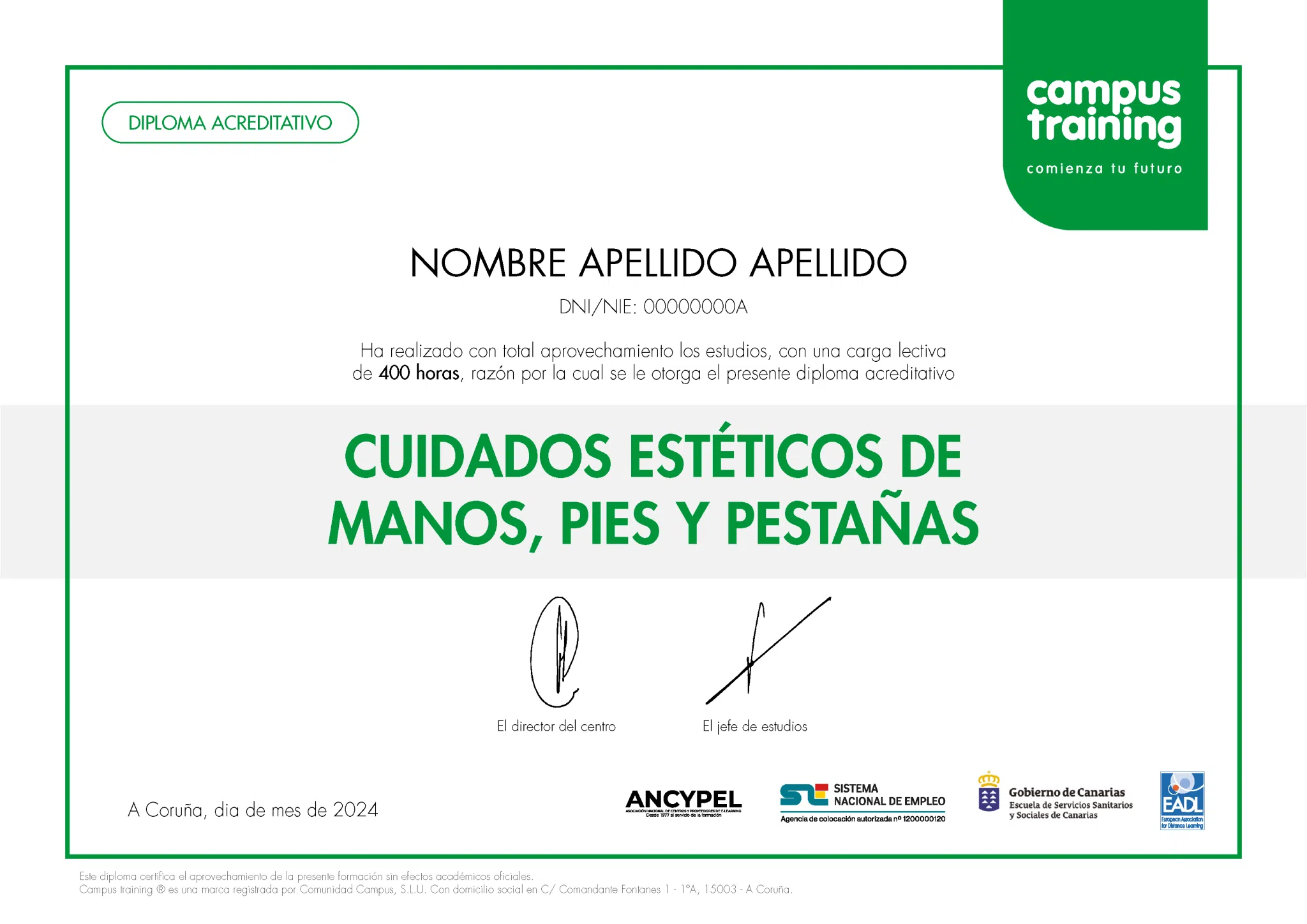 Al superar tu formación, obtendrás un diploma propio de Campus Training. Además, estarás preparado para conseguir el certificado de profesionalidad IMPP0108 de Cuidados Estéticos de Manos y Pies, ya que los contenidos del programa se ajustan a esta titulación.