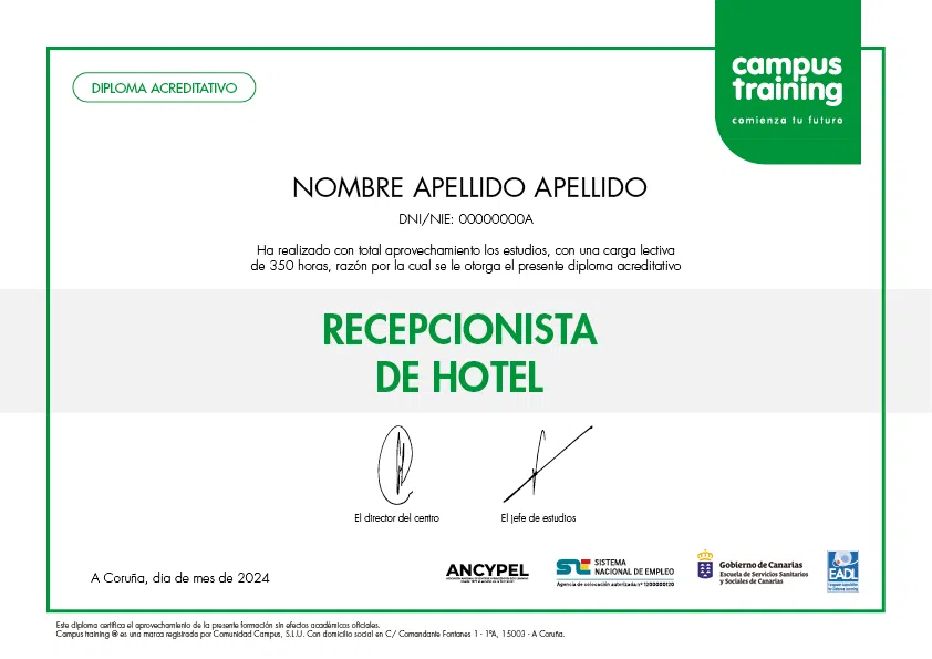 Al finalizar el curso, podrás obtener una doble titulación que acreditará tus competencias profesionales como recepcionista de hotel. Además, incluye otras acreditaciones que acelerarán tu entrada en el mercado laboral.
